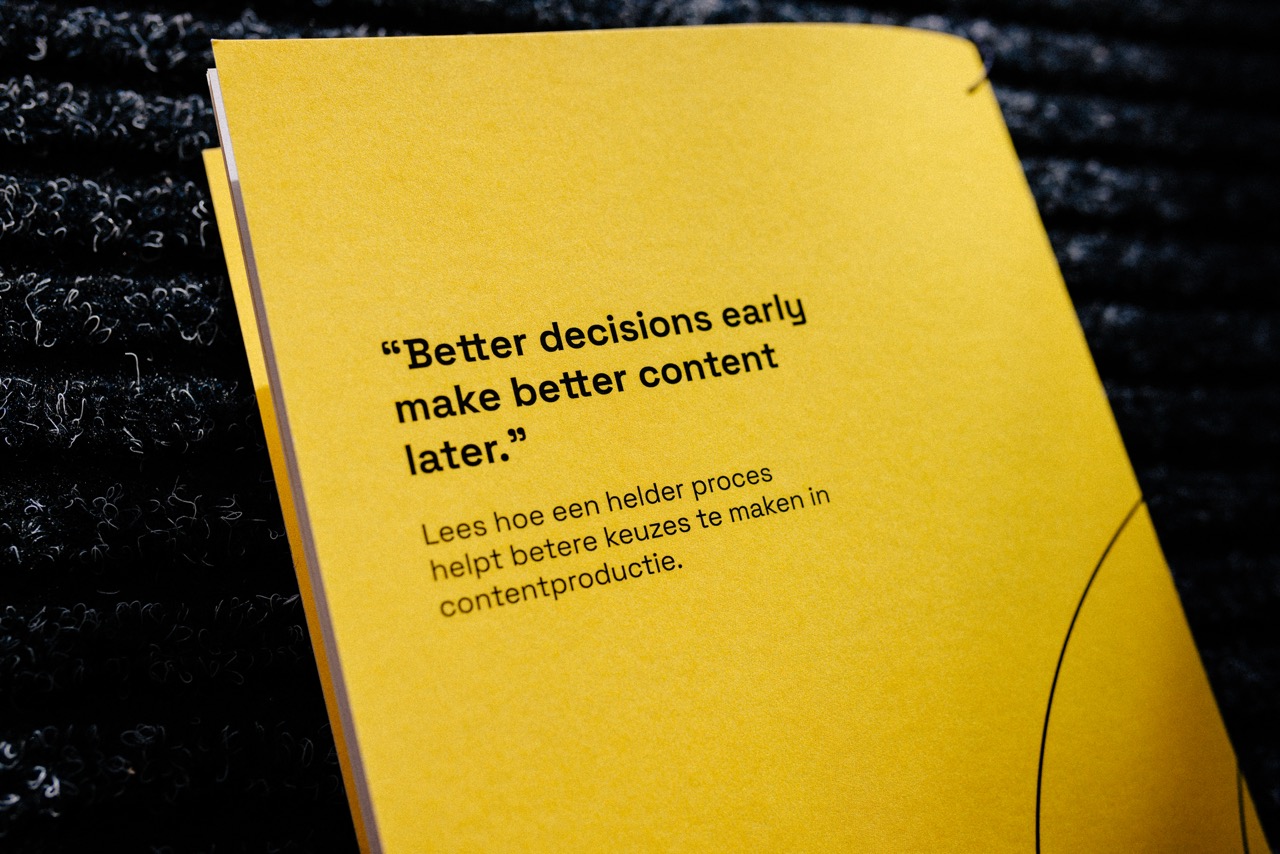 Omdat deze manier van werken zich in de praktijk keer op keer heeft bewezen, hebben we het framework vastgelegd in een compact boekje. Niet als handleiding of theorie, maar als referentie. Een denkkader dat helpt om gesprekken te voeren en samen beter te werken aan content. We gebruiken dit framework dagelijks in onze projecten, maar delen het bewust ook open. Omdat we geloven dat betere processen leiden tot betere samenwerking en uiteindelijk tot betere content.